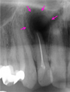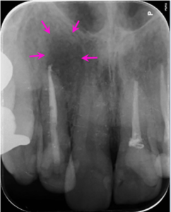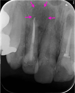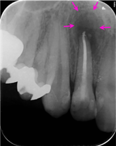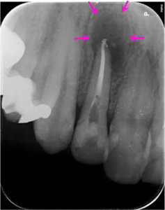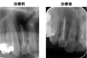 左図のレントゲン写真では右上2番の根の先に炎症があり大きく骨が溶けている部分があります(矢印部) 。