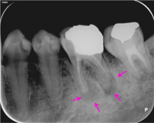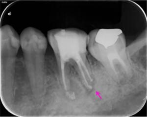 根の治療2か月後のレントゲン写真です。矢印の部分の骨の溶けている部分の大きさが小さくなっています。