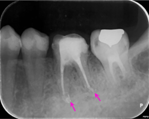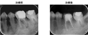 左図のレントゲン写真では根の先に炎症があり骨が溶けている部分があります(矢印部) 。