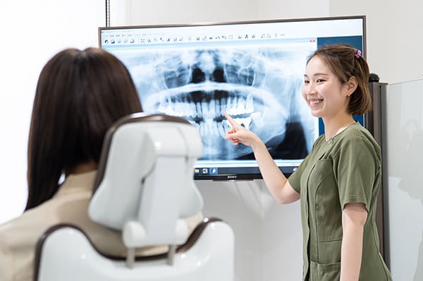 歯を支える骨(歯槽骨)の状態をレントゲン画像で確認し、歯周病の進行状況を客観的に把握します。